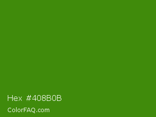 Hex #408b0b Color is a dark green color and the nearest color is La Palma #368716. Hex code #408b0b and RGB value is rgb(64,139,11). In RGB color space, this color is composed of 25% red, 55% green, 4% blue, In CMYK color space, this color is composed of 54% cyan, 0% magenta, 92% yellow , 45% black , In HSL color space, this color has a hue angle of 95° , 85% saturation and 29% lightness.