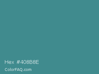 Hex #408b8e Color is a normal cyan color and the nearest color is Smalt Blue #51808f. Hex code #408b8e and RGB value is rgb(64,139,142). In RGB color space, this color is composed of 25% red, 55% green, 56% blue, In CMYK color space, this color is composed of 55% cyan, 2% magenta, 0% yellow , 44% black , In HSL color space, this color has a hue angle of 182° , 38% saturation and 40% lightness.
