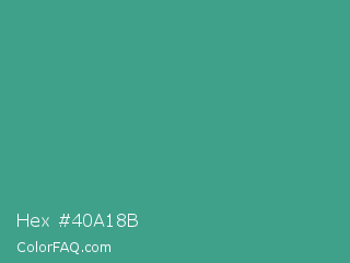 Hex #40a18b Color is a normal cyan color and the nearest color is Zomp #39a78e. Hex code #40a18b and RGB value is rgb(64,161,139). In RGB color space, this color is composed of 25% red, 63% green, 55% blue, In CMYK color space, this color is composed of 60% cyan, 0% magenta, 14% yellow , 37% black , In HSL color space, this color has a hue angle of 166° , 43% saturation and 44% lightness.