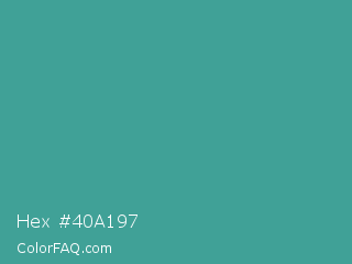 Hex #40a197 Color is a normal cyan color and the nearest color is Zomp #39a78e. Hex code #40a197 and RGB value is rgb(64,161,151). In RGB color space, this color is composed of 25% red, 63% green, 59% blue, In CMYK color space, this color is composed of 60% cyan, 0% magenta, 6% yellow , 37% black , In HSL color space, this color has a hue angle of 174° , 43% saturation and 44% lightness.