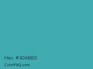 Hex #40abb0 Color is a normal cyan color and the nearest color is Verdigris #43b3ae. Hex code #40abb0 and RGB value is rgb(64,171,176). In RGB color space, this color is composed of 25% red, 67% green, 69% blue, In CMYK color space, this color is composed of 64% cyan, 3% magenta, 0% yellow , 31% black , In HSL color space, this color has a hue angle of 183° , 47% saturation and 47% lightness.