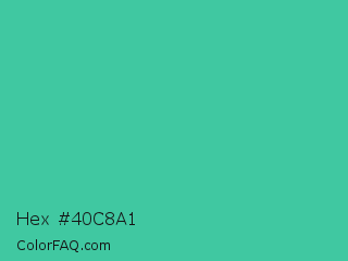Hex #40c8a1 Color is a normal green color and the nearest color is Puerto Rico #3fc1aa. Hex code #40c8a1 and RGB value is rgb(64,200,161). In RGB color space, this color is composed of 25% red, 78% green, 63% blue, In CMYK color space, this color is composed of 68% cyan, 0% magenta, 20% yellow , 22% black , In HSL color space, this color has a hue angle of 163° , 55% saturation and 52% lightness.