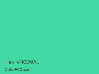 Hex #40d9a1 Color is a normal green color and the nearest color is Eucalyptus #44d7a8. Hex code #40d9a1 and RGB value is rgb(64,217,161). In RGB color space, this color is composed of 25% red, 85% green, 63% blue, In CMYK color space, this color is composed of 71% cyan, 0% magenta, 26% yellow , 15% black , In HSL color space, this color has a hue angle of 158° , 67% saturation and 55% lightness.