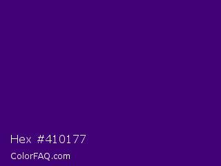 Hex #410177 Color is a dark purple color and the nearest color is Windsor #3c0878. Hex code #410177 and RGB value is rgb(65,1,119). In RGB color space, this color is composed of 25% red, 0% green, 47% blue, In CMYK color space, this color is composed of 45% cyan, 99% magenta, 0% yellow , 53% black , In HSL color space, this color has a hue angle of 273° , 98% saturation and 24% lightness.