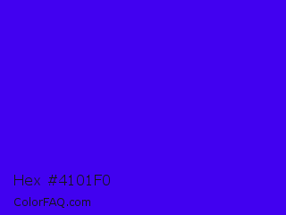 Hex #4101f0 Color is a normal indigo color and the nearest color is Electric Ultramarine #3f00ff. Hex code #4101f0 and RGB value is rgb(65,1,240). In RGB color space, this color is composed of 25% red, 0% green, 94% blue, In CMYK color space, this color is composed of 73% cyan, 100% magenta, 0% yellow , 6% black , In HSL color space, this color has a hue angle of 256° , 99% saturation and 47% lightness.
