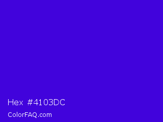 Hex #4103dc Color is a normal indigo color and the nearest color is Interdimensional Blue #360ccc. Hex code #4103dc and RGB value is rgb(65,3,220). In RGB color space, this color is composed of 25% red, 1% green, 86% blue, In CMYK color space, this color is composed of 70% cyan, 99% magenta, 0% yellow , 14% black , In HSL color space, this color has a hue angle of 257° , 97% saturation and 44% lightness.