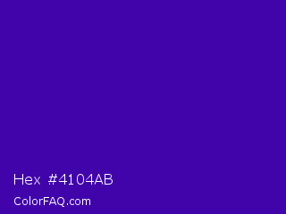 Hex #4104ab Color is a normal violet color and the nearest color is Interdimensional Blue #360ccc. Hex code #4104ab and RGB value is rgb(65,4,171). In RGB color space, this color is composed of 25% red, 2% green, 67% blue, In CMYK color space, this color is composed of 62% cyan, 98% magenta, 0% yellow , 33% black , In HSL color space, this color has a hue angle of 262° , 95% saturation and 34% lightness.