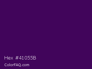 Hex #41055b Color is a very dark purple color and the nearest color is Ripe Plum #410056. Hex code #41055b and RGB value is rgb(65,5,91). In RGB color space, this color is composed of 25% red, 2% green, 36% blue, In CMYK color space, this color is composed of 29% cyan, 95% magenta, 0% yellow , 64% black , In HSL color space, this color has a hue angle of 282° , 90% saturation and 19% lightness.