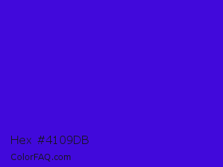 Hex #4109db Color is a normal indigo color and the nearest color is Interdimensional Blue #360ccc. Hex code #4109db and RGB value is rgb(65,9,219). In RGB color space, this color is composed of 25% red, 4% green, 86% blue, In CMYK color space, this color is composed of 70% cyan, 96% magenta, 0% yellow , 14% black , In HSL color space, this color has a hue angle of 256° , 92% saturation and 45% lightness.