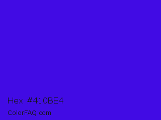 Hex #410be4 Color is a normal indigo color and the nearest color is Interdimensional Blue #360ccc. Hex code #410be4 and RGB value is rgb(65,11,228). In RGB color space, this color is composed of 25% red, 4% green, 89% blue, In CMYK color space, this color is composed of 71% cyan, 95% magenta, 0% yellow , 11% black , In HSL color space, this color has a hue angle of 255° , 91% saturation and 47% lightness.