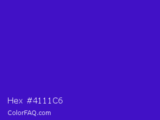 Hex #4111c6 Color is a normal indigo color and the nearest color is Interdimensional Blue #360ccc. Hex code #4111c6 and RGB value is rgb(65,17,198). In RGB color space, this color is composed of 25% red, 7% green, 78% blue, In CMYK color space, this color is composed of 67% cyan, 91% magenta, 0% yellow , 22% black , In HSL color space, this color has a hue angle of 256° , 84% saturation and 42% lightness.