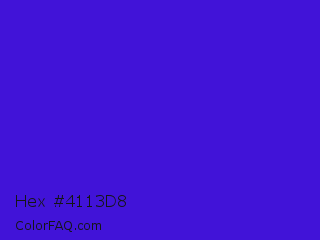 Hex #4113d8 Color is a normal indigo color and the nearest color is Interdimensional Blue #360ccc. Hex code #4113d8 and RGB value is rgb(65,19,216). In RGB color space, this color is composed of 25% red, 7% green, 85% blue, In CMYK color space, this color is composed of 70% cyan, 91% magenta, 0% yellow , 15% black , In HSL color space, this color has a hue angle of 254° , 84% saturation and 46% lightness.