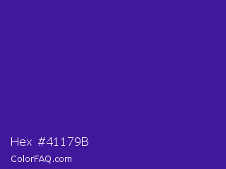 Hex #41179b Color is a normal indigo color and the nearest color is Daisy Bush #4f2398. Hex code #41179b and RGB value is rgb(65,23,155). In RGB color space, this color is composed of 25% red, 9% green, 61% blue, In CMYK color space, this color is composed of 58% cyan, 85% magenta, 0% yellow , 39% black , In HSL color space, this color has a hue angle of 259° , 74% saturation and 35% lightness.
