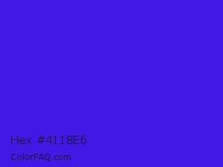 Hex #4118e6 Color is a normal indigo color and the nearest color is Han Purple #5218fa. Hex code #4118e6 and RGB value is rgb(65,24,230). In RGB color space, this color is composed of 25% red, 9% green, 90% blue, In CMYK color space, this color is composed of 72% cyan, 90% magenta, 0% yellow , 10% black , In HSL color space, this color has a hue angle of 252° , 81% saturation and 50% lightness.