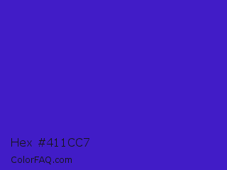 Hex #411cc7 Color is a normal indigo color and the nearest color is Interdimensional Blue #360ccc. Hex code #411cc7 and RGB value is rgb(65,28,199). In RGB color space, this color is composed of 25% red, 11% green, 78% blue, In CMYK color space, this color is composed of 67% cyan, 86% magenta, 0% yellow , 22% black , In HSL color space, this color has a hue angle of 253° , 75% saturation and 45% lightness.
