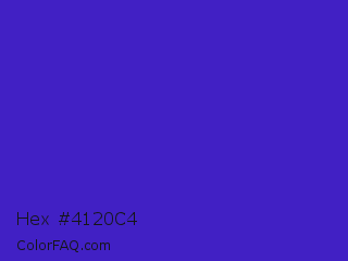 Hex #4120c4 Color is a normal indigo color and the nearest color is Interdimensional Blue #360ccc. Hex code #4120c4 and RGB value is rgb(65,32,196). In RGB color space, this color is composed of 25% red, 13% green, 77% blue, In CMYK color space, this color is composed of 67% cyan, 84% magenta, 0% yellow , 23% black , In HSL color space, this color has a hue angle of 252° , 72% saturation and 45% lightness.