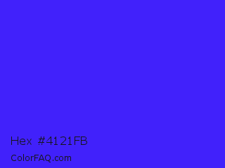 Hex #4121fb Color is a normal indigo color and the nearest color is Han Purple #5218fa. Hex code #4121fb and RGB value is rgb(65,33,251). In RGB color space, this color is composed of 25% red, 13% green, 98% blue, In CMYK color space, this color is composed of 74% cyan, 87% magenta, 0% yellow , 2% black , In HSL color space, this color has a hue angle of 249° , 96% saturation and 56% lightness.