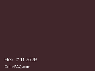 Hex #41262b Color is a very dark red color and the nearest color is Crater Brown #462425. Hex code #41262b and RGB value is rgb(65,38,43). In RGB color space, this color is composed of 25% red, 15% green, 17% blue, In CMYK color space, this color is composed of 0% cyan, 42% magenta, 34% yellow , 75% black , In HSL color space, this color has a hue angle of 349° , 26% saturation and 20% lightness.