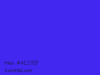 Hex #4127ef Color is a normal indigo color and the nearest color is Han Purple #5218fa. Hex code #4127ef and RGB value is rgb(65,39,239). In RGB color space, this color is composed of 25% red, 15% green, 94% blue, In CMYK color space, this color is composed of 73% cyan, 84% magenta, 0% yellow , 6% black , In HSL color space, this color has a hue angle of 248° , 86% saturation and 55% lightness.
