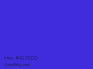 Hex #412cdd Color is a normal indigo color and the nearest color is Palatinate Blue #273be2. Hex code #412cdd and RGB value is rgb(65,44,221). In RGB color space, this color is composed of 25% red, 17% green, 87% blue, In CMYK color space, this color is composed of 71% cyan, 80% magenta, 0% yellow , 13% black , In HSL color space, this color has a hue angle of 247° , 72% saturation and 52% lightness.