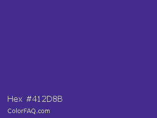 Hex #412d8b Color is a normal indigo color and the nearest color is Minsk #3f307f. Hex code #412d8b and RGB value is rgb(65,45,139). In RGB color space, this color is composed of 25% red, 18% green, 55% blue, In CMYK color space, this color is composed of 53% cyan, 68% magenta, 0% yellow , 45% black , In HSL color space, this color has a hue angle of 253° , 51% saturation and 36% lightness.