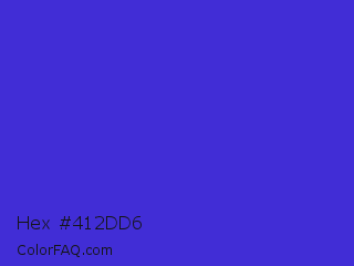 Hex #412dd6 Color is a normal indigo color and the nearest color is Palatinate Blue #273be2. Hex code #412dd6 and RGB value is rgb(65,45,214). In RGB color space, this color is composed of 25% red, 18% green, 84% blue, In CMYK color space, this color is composed of 70% cyan, 79% magenta, 0% yellow , 16% black , In HSL color space, this color has a hue angle of 247° , 67% saturation and 51% lightness.