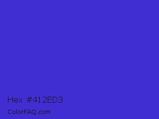 Hex #412ed3 Color is a normal indigo color and the nearest color is Palatinate Blue #273be2. Hex code #412ed3 and RGB value is rgb(65,46,211). In RGB color space, this color is composed of 25% red, 18% green, 83% blue, In CMYK color space, this color is composed of 69% cyan, 78% magenta, 0% yellow , 17% black , In HSL color space, this color has a hue angle of 247° , 65% saturation and 50% lightness.