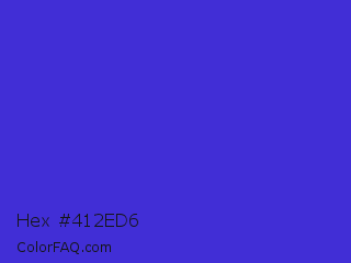 Hex #412ed6 Color is a normal indigo color and the nearest color is Palatinate Blue #273be2. Hex code #412ed6 and RGB value is rgb(65,46,214). In RGB color space, this color is composed of 25% red, 18% green, 84% blue, In CMYK color space, this color is composed of 70% cyan, 79% magenta, 0% yellow , 16% black , In HSL color space, this color has a hue angle of 247° , 67% saturation and 51% lightness.