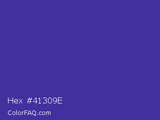 Hex #41309e Color is a normal indigo color and the nearest color is Blue Pigment #333399. Hex code #41309e and RGB value is rgb(65,48,158). In RGB color space, this color is composed of 25% red, 19% green, 62% blue, In CMYK color space, this color is composed of 59% cyan, 70% magenta, 0% yellow , 38% black , In HSL color space, this color has a hue angle of 249° , 53% saturation and 40% lightness.