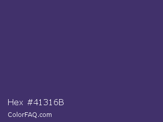 Hex #41316b Color is a normal indigo color and the nearest color is Jacarta #3a2a6a. Hex code #41316b and RGB value is rgb(65,49,107). In RGB color space, this color is composed of 25% red, 19% green, 42% blue, In CMYK color space, this color is composed of 39% cyan, 54% magenta, 0% yellow , 58% black , In HSL color space, this color has a hue angle of 257° , 37% saturation and 31% lightness.