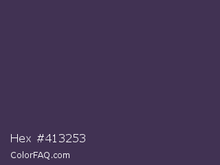 Hex #413253 Color is a dark violet color and the nearest color is Martinique #363050. Hex code #413253 and RGB value is rgb(65,50,83). In RGB color space, this color is composed of 25% red, 20% green, 33% blue, In CMYK color space, this color is composed of 22% cyan, 40% magenta, 0% yellow , 67% black , In HSL color space, this color has a hue angle of 267° , 25% saturation and 26% lightness.