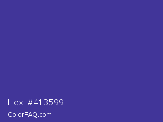 Hex #413599 Color is a normal indigo color and the nearest color is Blue Pigment #333399. Hex code #413599 and RGB value is rgb(65,53,153). In RGB color space, this color is composed of 25% red, 21% green, 60% blue, In CMYK color space, this color is composed of 58% cyan, 65% magenta, 0% yellow , 40% black , In HSL color space, this color has a hue angle of 247° , 49% saturation and 40% lightness.