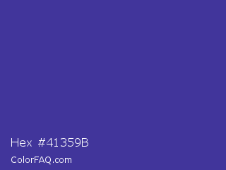 Hex #41359b Color is a normal indigo color and the nearest color is Blue Pigment #333399. Hex code #41359b and RGB value is rgb(65,53,155). In RGB color space, this color is composed of 25% red, 21% green, 61% blue, In CMYK color space, this color is composed of 58% cyan, 66% magenta, 0% yellow , 39% black , In HSL color space, this color has a hue angle of 247° , 49% saturation and 41% lightness.