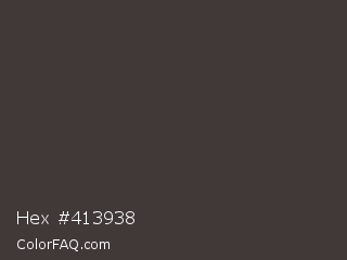 Hex #413938 Color is a dark red color and the nearest color is Masala #403b38. Hex code #413938 and RGB value is rgb(65,57,56). In RGB color space, this color is composed of 25% red, 22% green, 22% blue, In CMYK color space, this color is composed of 0% cyan, 12% magenta, 14% yellow , 75% black , In HSL color space, this color has a hue angle of 7° , 7% saturation and 24% lightness.