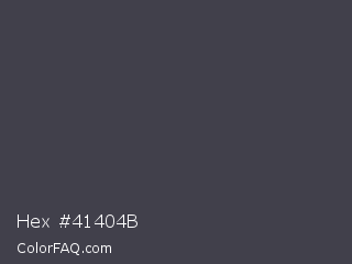Hex #41404b Color is a dark indigo color and the nearest color is Arsenic #3b444b. Hex code #41404b and RGB value is rgb(65,64,75). In RGB color space, this color is composed of 25% red, 25% green, 29% blue, In CMYK color space, this color is composed of 13% cyan, 15% magenta, 0% yellow , 71% black , In HSL color space, this color has a hue angle of 245° , 8% saturation and 27% lightness.