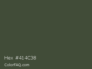 Hex #414c38 Color is a dark green color and the nearest color is Cabbage Pont #3f4c3a. Hex code #414c38 and RGB value is rgb(65,76,56). In RGB color space, this color is composed of 25% red, 30% green, 22% blue, In CMYK color space, this color is composed of 14% cyan, 0% magenta, 26% yellow , 70% black , In HSL color space, this color has a hue angle of 93° , 15% saturation and 26% lightness.