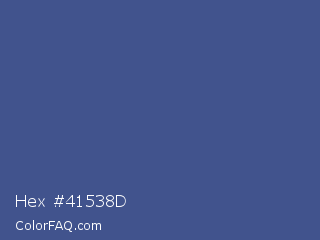 Hex #41538d Color is a normal blue color and the nearest color is Chambray #354e8c. Hex code #41538d and RGB value is rgb(65,83,141). In RGB color space, this color is composed of 25% red, 33% green, 55% blue, In CMYK color space, this color is composed of 54% cyan, 41% magenta, 0% yellow , 45% black , In HSL color space, this color has a hue angle of 226° , 37% saturation and 40% lightness.