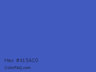 Hex #415ac0 Color is a normal blue color and the nearest color is Indigo #4f69c6. Hex code #415ac0 and RGB value is rgb(65,90,192). In RGB color space, this color is composed of 25% red, 35% green, 75% blue, In CMYK color space, this color is composed of 66% cyan, 53% magenta, 0% yellow , 25% black , In HSL color space, this color has a hue angle of 228° , 50% saturation and 50% lightness.