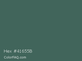 Hex #41655b Color is a normal green color and the nearest color is Mineral Green #3f5d53. Hex code #41655b and RGB value is rgb(65,101,91). In RGB color space, this color is composed of 25% red, 40% green, 36% blue, In CMYK color space, this color is composed of 36% cyan, 0% magenta, 10% yellow , 60% black , In HSL color space, this color has a hue angle of 163° , 22% saturation and 33% lightness.