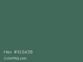 Hex #416a58 Color is a normal green color and the nearest color is Mineral Green #3f5d53. Hex code #416a58 and RGB value is rgb(65,106,88). In RGB color space, this color is composed of 25% red, 42% green, 35% blue, In CMYK color space, this color is composed of 39% cyan, 0% magenta, 17% yellow , 58% black , In HSL color space, this color has a hue angle of 154° , 24% saturation and 34% lightness.