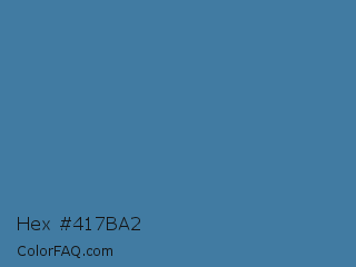 Hex #417ba2 Color is a normal blue color and the nearest color is Wedgewood #4e7f9e. Hex code #417ba2 and RGB value is rgb(65,123,162). In RGB color space, this color is composed of 25% red, 48% green, 64% blue, In CMYK color space, this color is composed of 60% cyan, 24% magenta, 0% yellow , 36% black , In HSL color space, this color has a hue angle of 204° , 43% saturation and 45% lightness.