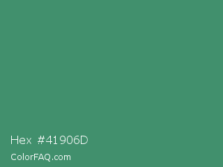Hex #41906d Color is a normal green color and the nearest color is Viridian #40826d. Hex code #41906d and RGB value is rgb(65,144,109). In RGB color space, this color is composed of 25% red, 56% green, 43% blue, In CMYK color space, this color is composed of 55% cyan, 0% magenta, 24% yellow , 44% black , In HSL color space, this color has a hue angle of 153° , 38% saturation and 41% lightness.