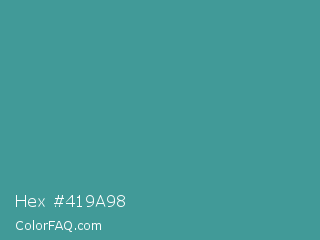 Hex #419a98 Color is a normal cyan color and the nearest color is Zomp #39a78e. Hex code #419a98 and RGB value is rgb(65,154,152). In RGB color space, this color is composed of 25% red, 60% green, 60% blue, In CMYK color space, this color is composed of 58% cyan, 0% magenta, 1% yellow , 40% black , In HSL color space, this color has a hue angle of 179° , 41% saturation and 43% lightness.