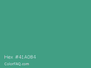 Hex #41a084 Color is a normal green color and the nearest color is Zomp #39a78e. Hex code #41a084 and RGB value is rgb(65,160,132). In RGB color space, this color is composed of 25% red, 63% green, 52% blue, In CMYK color space, this color is composed of 59% cyan, 0% magenta, 18% yellow , 37% black , In HSL color space, this color has a hue angle of 162° , 42% saturation and 44% lightness.