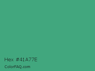 Hex #41a77e Color is a normal green color and the nearest color is Ocean Green #41aa78. Hex code #41a77e and RGB value is rgb(65,167,126). In RGB color space, this color is composed of 25% red, 65% green, 49% blue, In CMYK color space, this color is composed of 61% cyan, 0% magenta, 25% yellow , 35% black , In HSL color space, this color has a hue angle of 156° , 44% saturation and 45% lightness.