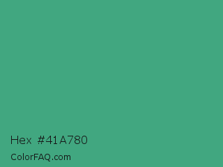 Hex #41a780 Color is a normal green color and the nearest color is Ocean Green #41aa78. Hex code #41a780 and RGB value is rgb(65,167,128). In RGB color space, this color is composed of 25% red, 65% green, 50% blue, In CMYK color space, this color is composed of 61% cyan, 0% magenta, 23% yellow , 35% black , In HSL color space, this color has a hue angle of 157° , 44% saturation and 45% lightness.