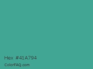 Hex #41a794 Color is a normal cyan color and the nearest color is Zomp #39a78e. Hex code #41a794 and RGB value is rgb(65,167,148). In RGB color space, this color is composed of 25% red, 65% green, 58% blue, In CMYK color space, this color is composed of 61% cyan, 0% magenta, 11% yellow , 35% black , In HSL color space, this color has a hue angle of 169° , 44% saturation and 45% lightness.