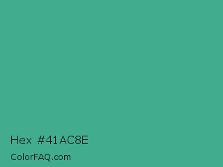 Hex #41ac8e Color is a normal green color and the nearest color is Zomp #39a78e. Hex code #41ac8e and RGB value is rgb(65,172,142). In RGB color space, this color is composed of 25% red, 67% green, 56% blue, In CMYK color space, this color is composed of 62% cyan, 0% magenta, 17% yellow , 33% black , In HSL color space, this color has a hue angle of 163° , 45% saturation and 46% lightness.