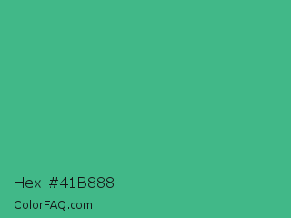 Hex #41b888 Color is a normal green color and the nearest color is Mint #3eb489. Hex code #41b888 and RGB value is rgb(65,184,136). In RGB color space, this color is composed of 25% red, 72% green, 53% blue, In CMYK color space, this color is composed of 65% cyan, 0% magenta, 26% yellow , 28% black , In HSL color space, this color has a hue angle of 156° , 48% saturation and 49% lightness.