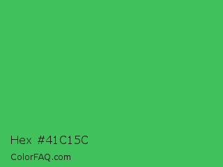 Hex #41c15c Color is a normal green color and the nearest color is Chateau Green #40a860. Hex code #41c15c and RGB value is rgb(65,193,92). In RGB color space, this color is composed of 25% red, 76% green, 36% blue, In CMYK color space, this color is composed of 66% cyan, 0% magenta, 52% yellow , 24% black , In HSL color space, this color has a hue angle of 133° , 51% saturation and 51% lightness.